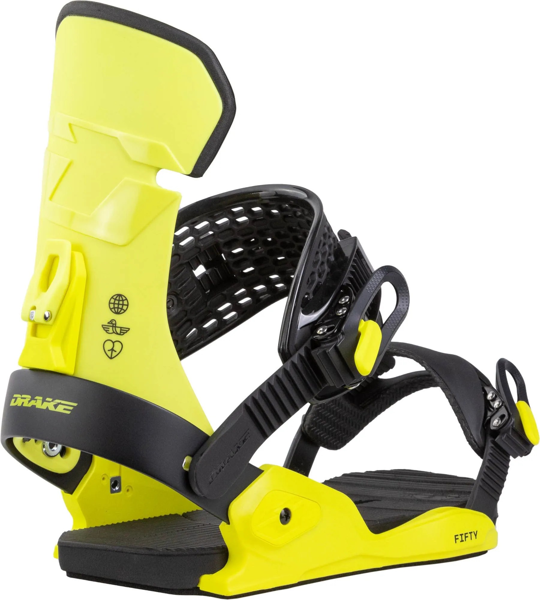 La fixation de snowboard DRAKE Fifty combine légèreté, réactivité et confort pour un ride freestyle précis et dynamique, du park à toute la station.