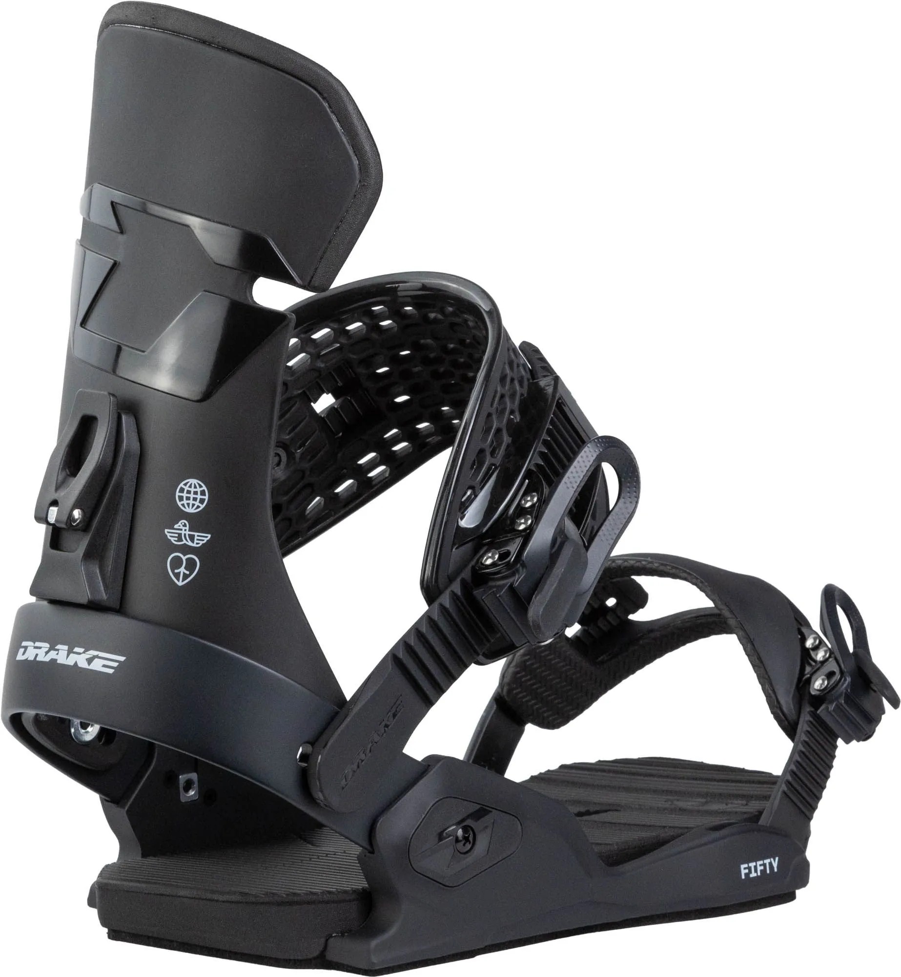 La fixation de snowboard DRAKE Fifty combine légèreté, réactivité et confort pour un ride freestyle précis et dynamique, du park à toute la station.
